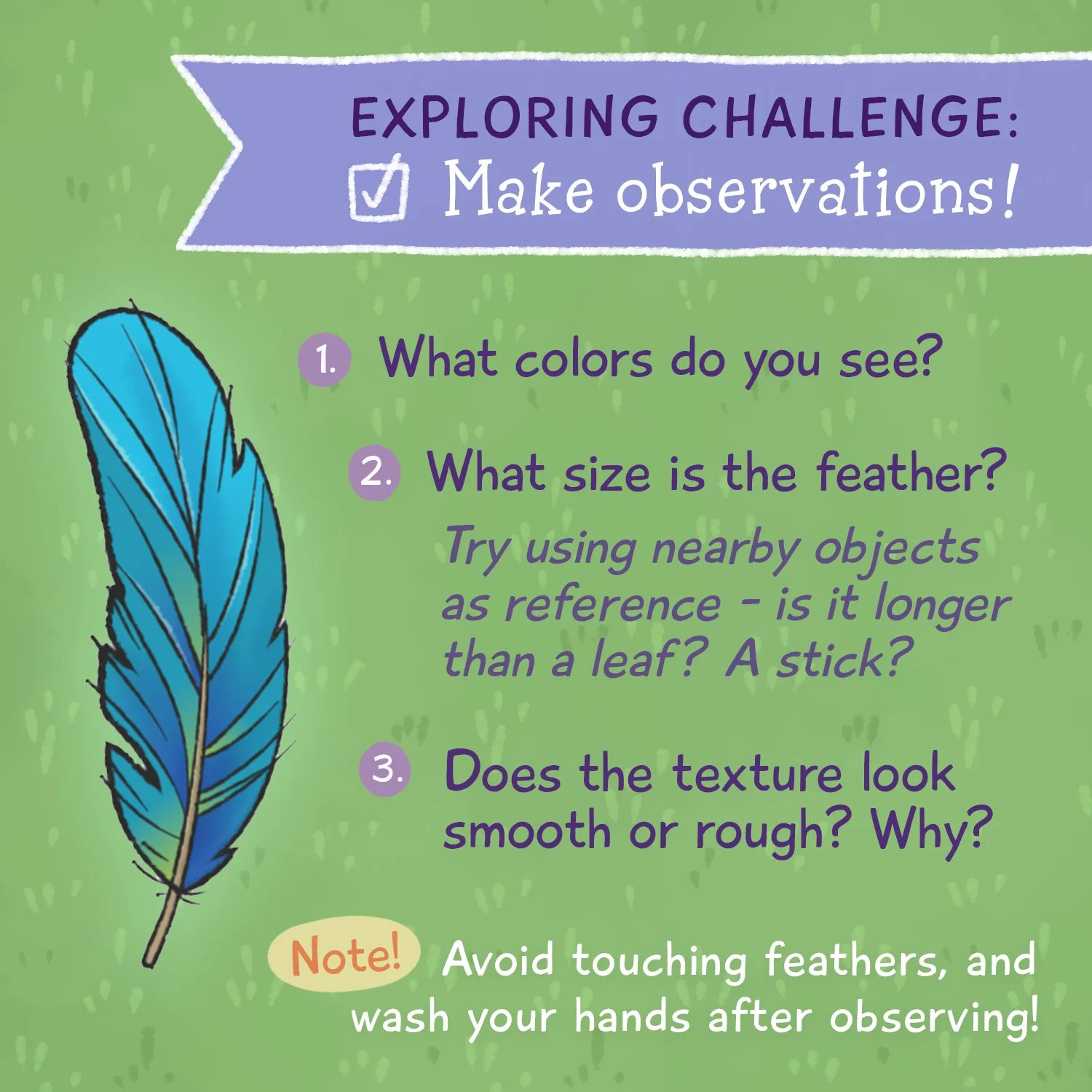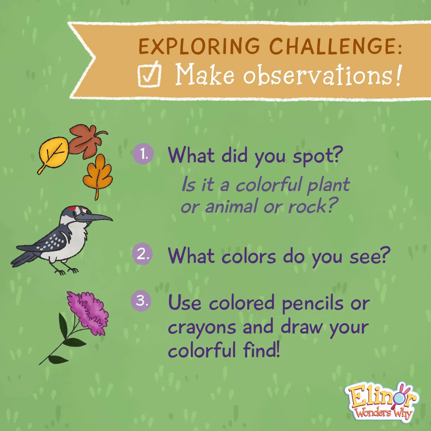 I created short exploring challenges to pair with the longer episode-specific activities, because engaging with nature can be simple! We wanted to empower parents with prompts to explore and observe the world around them, using the skills they already had.